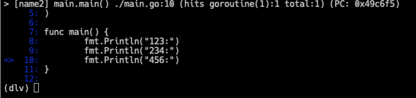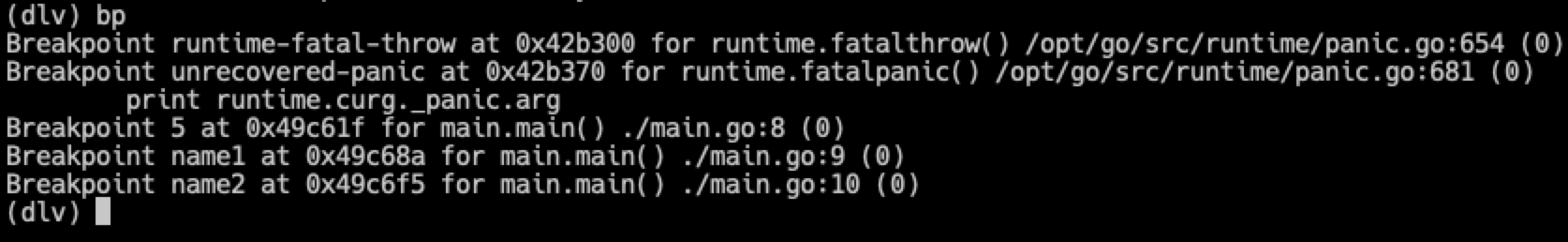 b main.go:8 #在main.go的第8行设置断点 b name1 main.go:9 #在main.go的第9行设置断点,断点名称为name1 b name2 main.go:10 #在main.go的第10行设置断点,断点名称为name2