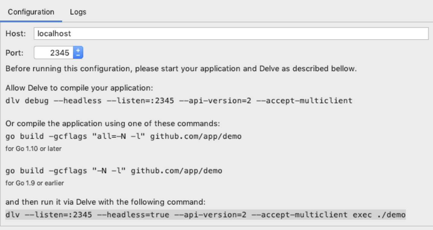 dlv --listen=:2345 --headless=true --api-version=2 --accept-multiclient exec ./main配置Goland