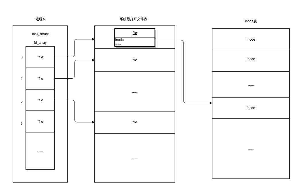 进程每打开一个文件就会从fd_array中找到一个未使用的最小的位置,在里面初始化一个指向file结构的指针