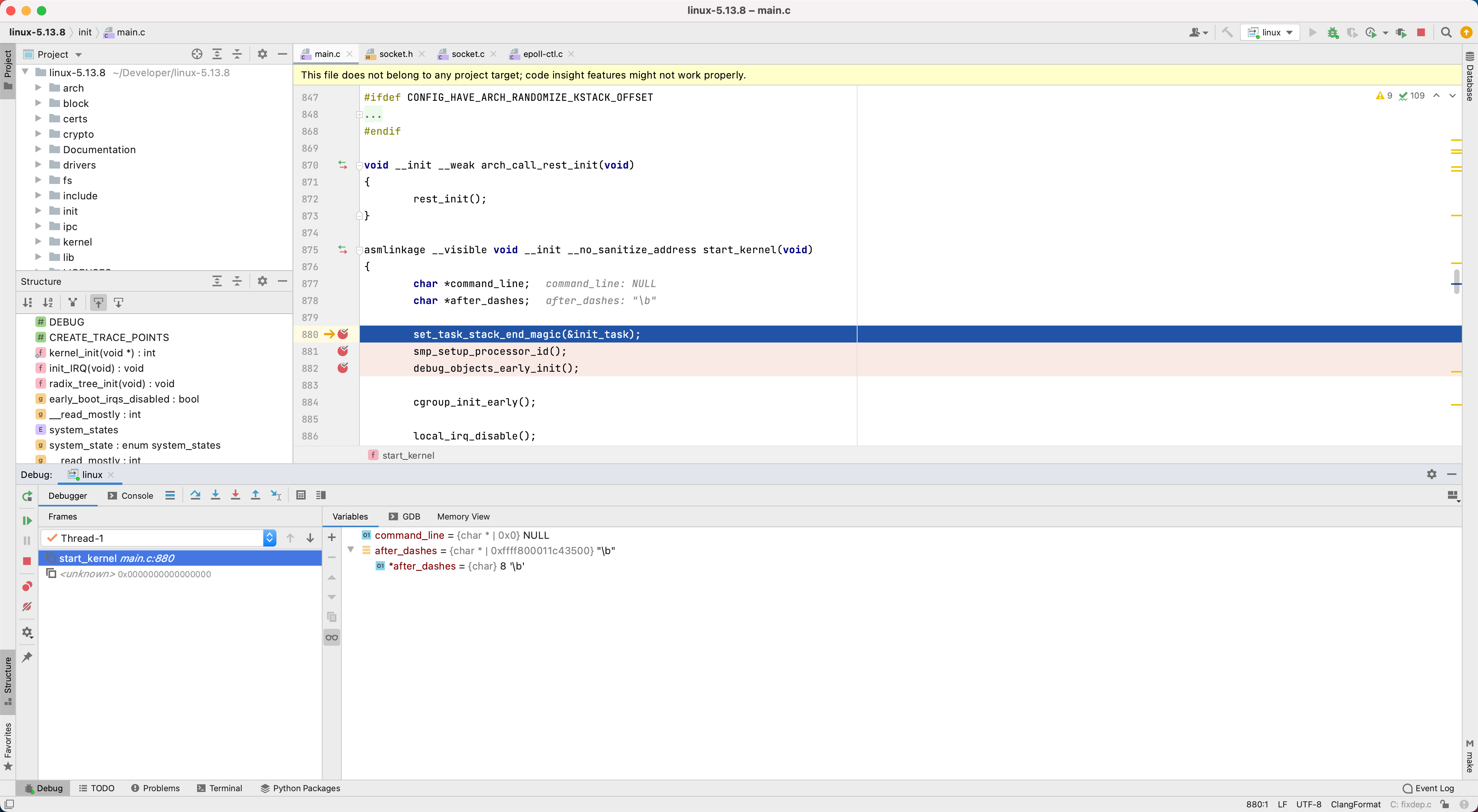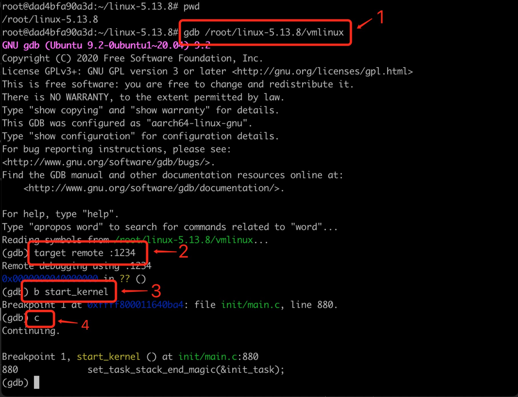 此时我们可以使用gdb进行连接调试了,要注意的是gdb启动的时候需要跟一个符号文件,该文件是在第一步编译内核时产生的/root/linux-5.13.8/vmlinux