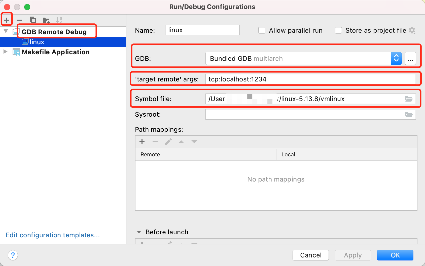 在本地下载好linux内核源码(当然这里也可以直接从你搭建环境的服务器上拉取,看个人喜好),并用clion打开。 接下来开始配置clion 点开右上角的debug配置界面,然后点击+号新增一个GDB Remote Debug